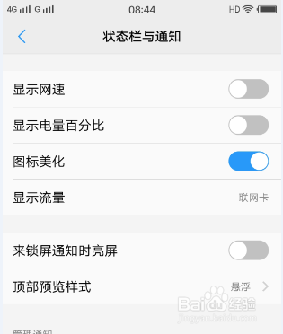 点击状况栏与通知后,界面中有显示网上、显示电量百分比、图标美化等按钮。