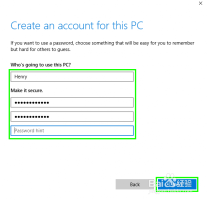 8. 输入用户名,输入账户密码两次,输入线索并选择下一步。