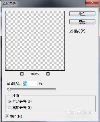 单击“滤镜”/“杂色”/“添加杂色”号令,在弹出的对话框内设置“数目”为20%,单击“确定”按钮。