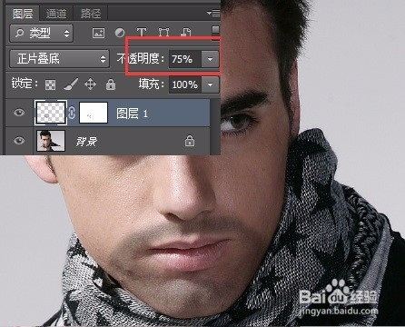 2、设置前景色为黑色,选择画笔东西,设置“不透明度”为75%。