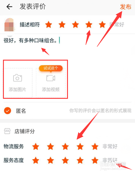 接着评价页面,可觉得3种环境打星,包罗商品、物流等,内容填上本身想说的话,还可插入图片等,如需匿名,可以勾选,全数填写完当作,点发布即可。