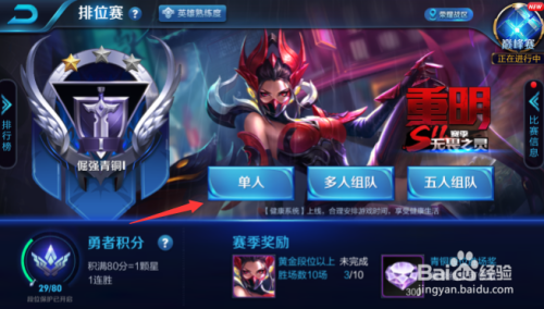在排位赛界面点击单人按钮,起头匹配,匹配当作功进入游戏。