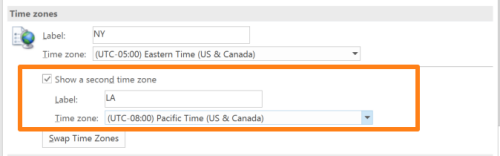 若是您但愿在日历中的当前日历之前看到第二个时区,请返回日历设置并点击“互换时区”按钮。可是请注重,这会将Windows系统托盘中显示的时候更改为其他时区!