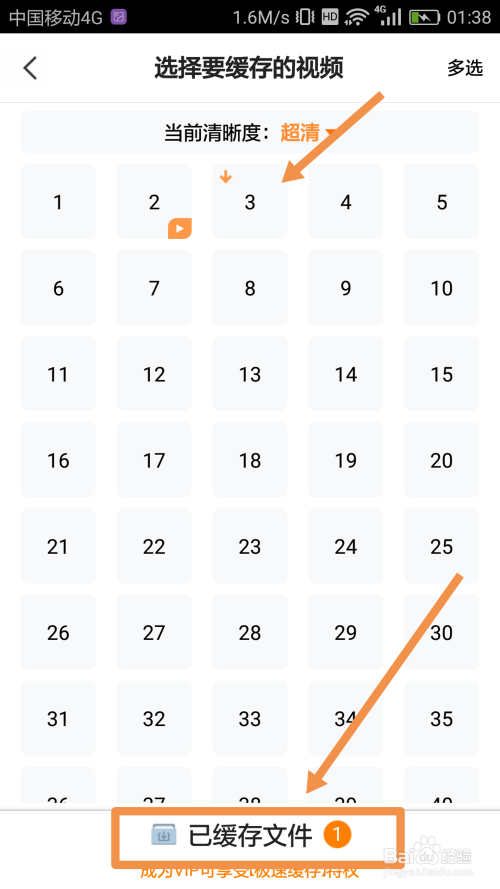 在【选择缓存的视频】界面中,点击要下载的视频,例如:要下载电视剧的第3集,就点击第3集;也可以选择下载该视频的清楚度,如图:
