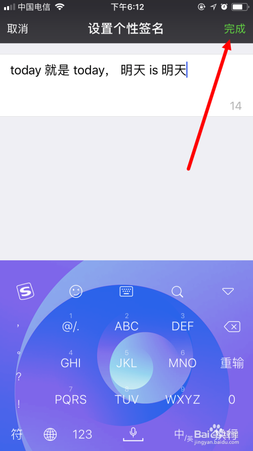 最后一步,就是将以前的内容删除,输入新的个性签名内容,再点击 完当作 就可以了。