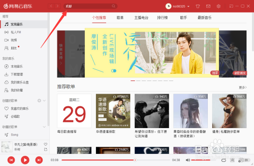 打开网易云音乐后,我们可以看到上方有一个搜刮窗口。