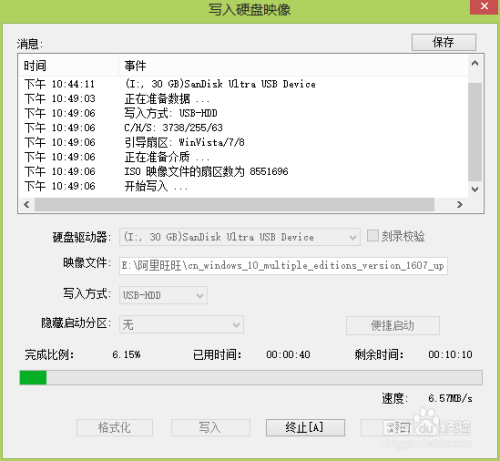 点击“启动”-“写入硬盘映像”,写入体例改为“USB-HDD”,然后插入我们的U盘,或者前面你已经插入了也可以;点击“写入”。
