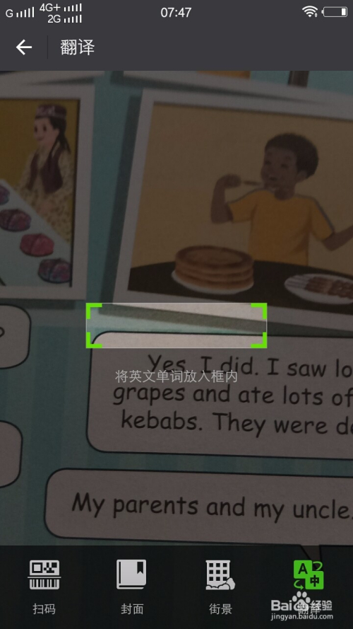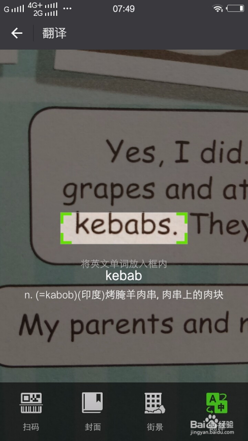 最后一个是英文单词翻译当作中文。打开微信扫一扫点击右下角翻译,中心的扫描方框会比之前缩小,将中心的方框瞄准你不熟悉的英文单词(单词要完整的呈此刻方框内),会顿时在屏幕上显示这个英文单词的中文诠释,很是便利。