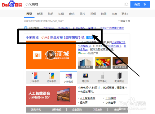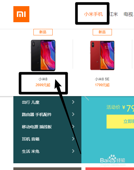 把鼠标移到到上方的【小米手机】就可以看到小米8了,点击进去