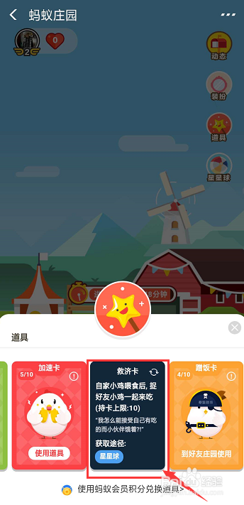 打开后我们可以看到,里面有4种卡片,别离为新蛋卡、加快卡、布施卡和蹭饭卡。如何获得新蛋卡呢?我们点击打开看一下。里面写着两种获得体例,一种是采办理财富品可获得。还有一种是线下付出满10笔可获得一枚新蛋卡。不外这个1周只能领取一次哦。一个新蛋卡半斤八两于一棵爱心。