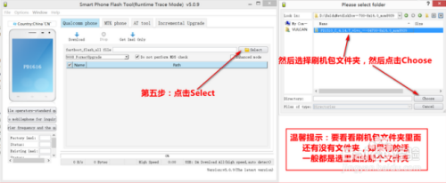 再点击select(查询)按钮,然后在右鸿沟面中选择刷机包文件夹,再点击choose(选择),这里需要注重的是要看刷机包文件夹里面还有没有文件夹,若是有的话一般都是选里面的阿谁文件夹,这个必然要注重,别搞错了,最后是选择刷机包