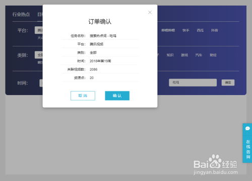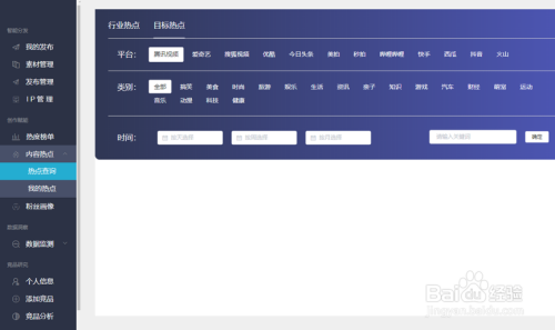 4、在【方针热点】中选择平台、类别和时候,然后输入要查询的关头词,点击确认。