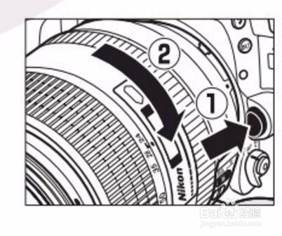 逆时针扭转镜头,当听到咔擦的入扣声音,释放镜头释放按钮