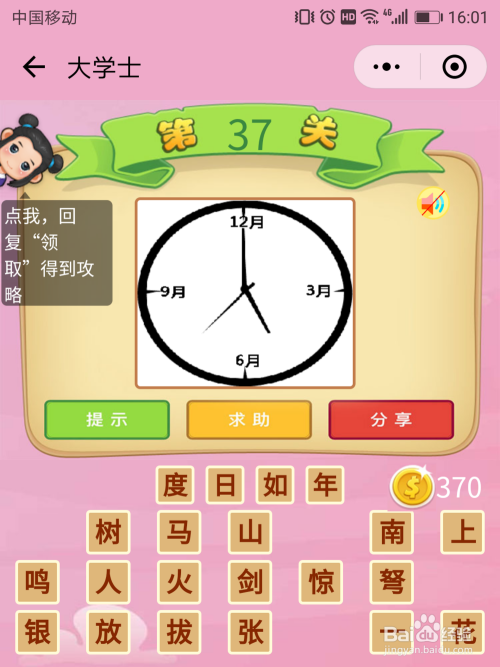 年夜学士37关谜底:若是粗心年夜意了,这个题就猜不出来,要细心看表盘上的内容,表盘上写的不是小时,而是月份,表盘上的12个月代表1年。而现实这个表应该代表1天。那么申明是过一年就像是过一年的感受,这事就是当作语【过活如年】所表达的意思。