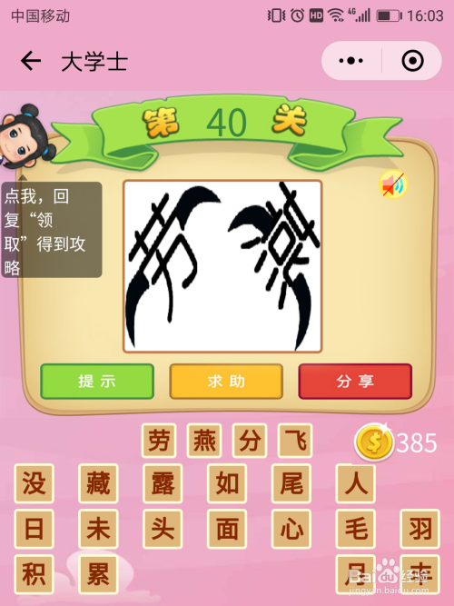 年夜学士40关谜底:两个汉字都长了同党,且分隔分享分歧的偏向,当作语便是【劳燕分飞】。