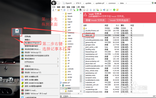我们顺着目次点击update 选择update.rpf 选择common 选择data 然后把dlclist.xml拖到电脑桌面, 对着dlclist.xml右键选择记事本打开,<Item>dlcpacks:\EVOZ\</Item> 注重格局,对其上面,如下图