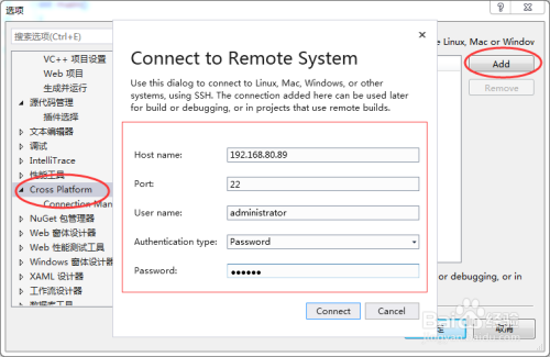 打开VS,菜单栏点击东西->选项,在弹出对话框中左侧选择Cross Platform, 右侧点击Add,在弹出框中设置装备摆设对应的信息,如下图所示: