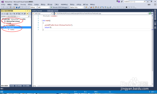 选择Console Application,项目名称改为VSLinuxTest,点击确定,VS会默认生当作main.cpp ,如下图所示: