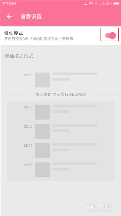 这里有个休闲模式,点击后方的按钮,变红色后申明追番设置已经打开。