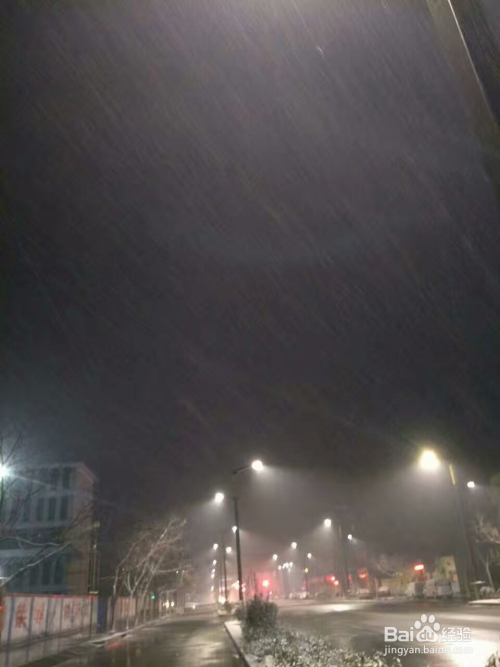用手机拍飘雪时,要注重光源角度的选择,可以站在灯光下,仰视斜对着灯光,可以拍出在灯光下的飘雪,结果也很是标致。