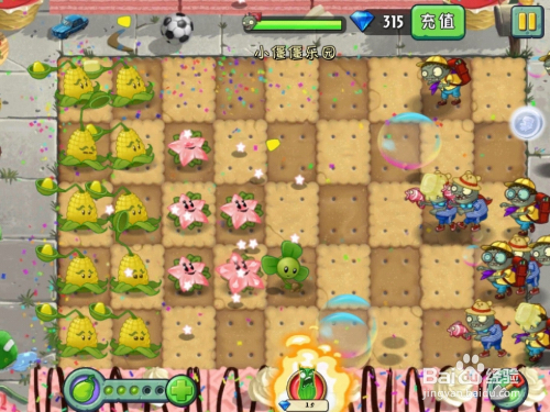 点击起头游戏,进入游戏可以发现游戏地图和僵尸都发生了转变。第一关比力简单,只需要在最后一排种上一排玉米投手,然后依次莳植其他植物即可。注重僵尸会释放彩色泡泡,这种泡泡会带走植物,所以需要实时利用三叶草吹走泡泡。