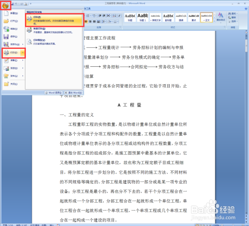 打开需要打印的文档,单击左上角的圆形图标,在出来的选项中选择【打印】,在出来的右边三个选项中单击【打印】,如图所示。