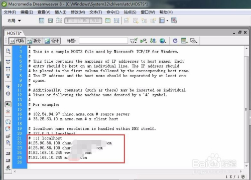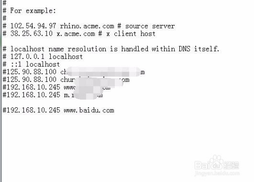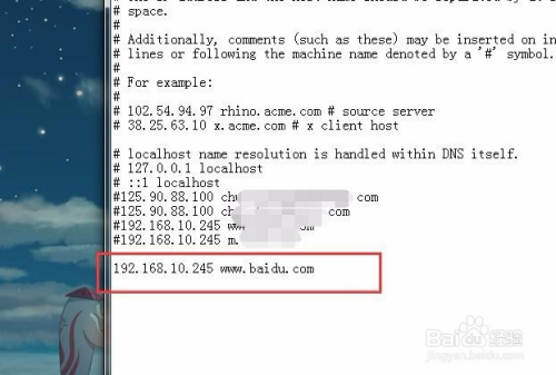 好比(192.168.10.245 百度网站域名)注重前面不带#号代表映射生效,带#则不生效。如许保留点窜hosts文件的内容后,我们再利用浏览器拜候百度网站域名就会打开我们的ip地址192.168.10.245上的内容,而不会打开真正的百度网站。