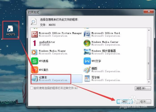 当然了我们这里不讲那些专业软件的,就利用记事本打开hosts文件吧,用鼠标双击hosts文件,然后在打开体例窗口中选择记事本打开,确定后hosts文件就用我们的记事本打开了。