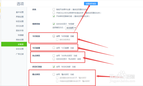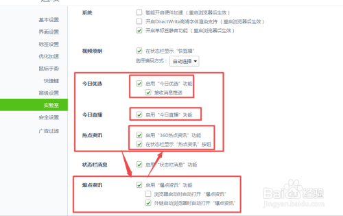 在打开的页面中将 今日优选、今日直播、热点资讯、爆点资讯 等选项前面框中的勾去失落。