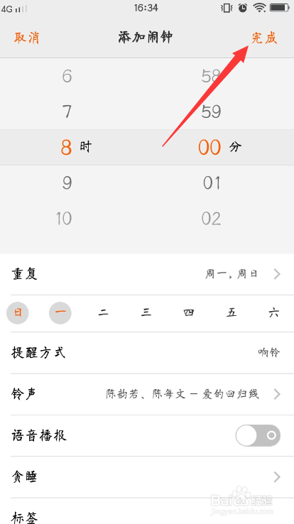 不克不及直接点击返回,要点击右上角的完当作,闹钟才算设置好了,