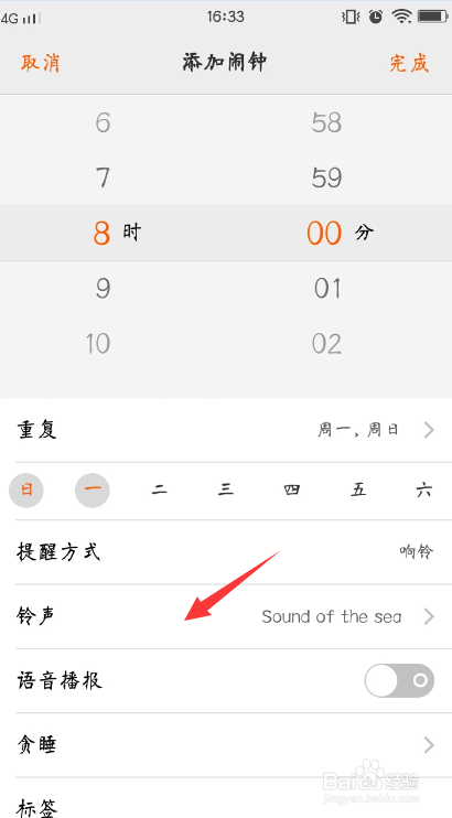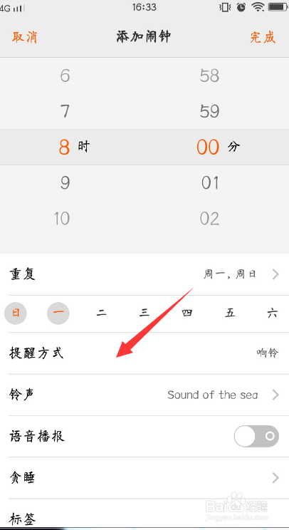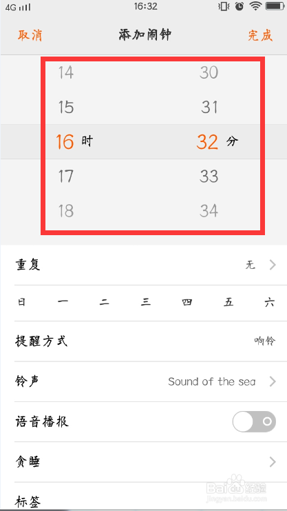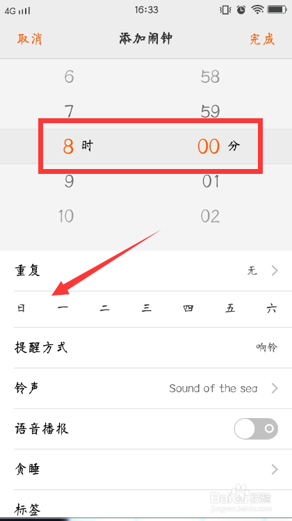 设置好后,可以选择是否反复,默认环境下是无反复,就是只响铃一次。若是是要天天都有这个闹钟,就要把周一到周日全数选中。