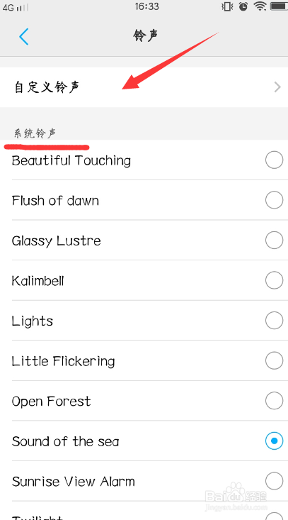 在系统铃声里找到喜好的铃声,或者点击最上面的自界说铃声。