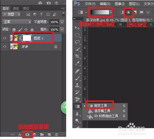 2、选择渐变东西,单击“径标的目的渐变”按钮,设置黑色到透明的渐变。