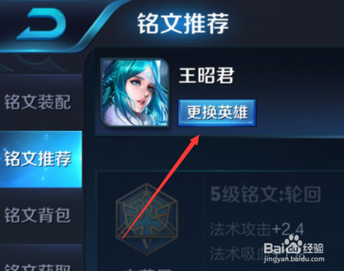 点击铭文保举之后我们这里把需要保举的英雄先选择进来(点击改换英雄即可选择。)