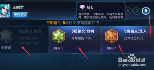 选择进来之后我们可以看到这里铭文是有品级划分的,最高档级是5,品级越高越好,我们选择5然后查看保举给该英雄的铭文。
