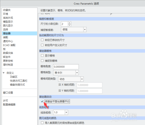 在”Creo Parametric 选项“对话框右边往下翻找到”草绘器启动“栏,勾选”使草绘平面与屏幕平行“复选框。