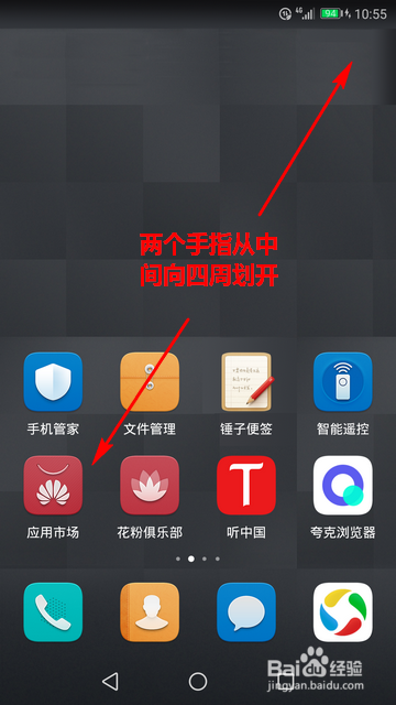 首先,两指捏合从手机桌面的中心标的目的两侧滑开。