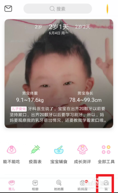 进入‘柚宝宝’的起先页面后,在上端已显出了宝图和龄段,从此照按入,若您没有传过,就点按右端最下的‘我’。