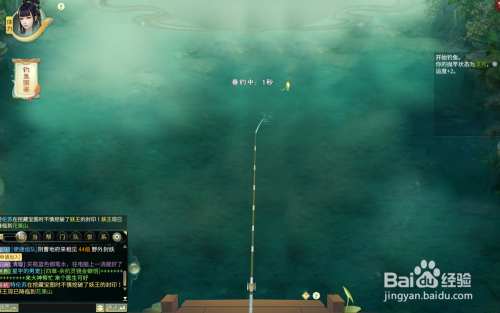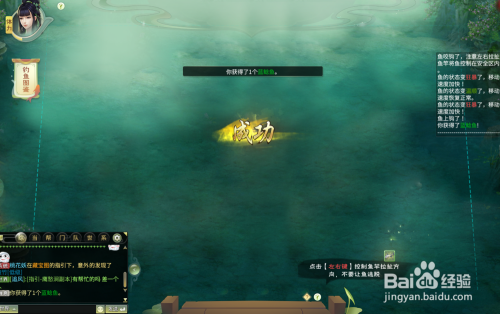 领取使命之后,会获得鱼竿等道具,到左侧水边,鼠标点击水里冒泡的位置,出来响应垂钓指引