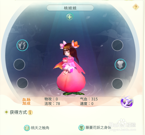 首先人物品级要到35,桃娃娃的携带品级为35,合当作所需:蓝色“桃夭之触角”和蓝色“藤蔓花妖之身体”