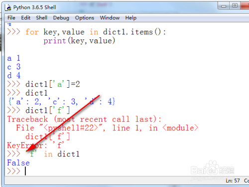 怎么查抄f是否在dict1里,来避免报错呢。用in这个方式,这里显示的是False,申明‘f’不在dict1的key里。