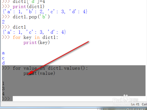 如何删除字典里的一组值呢?和删除list中的值一样,利用pop函数,这里就删除了第二组值。