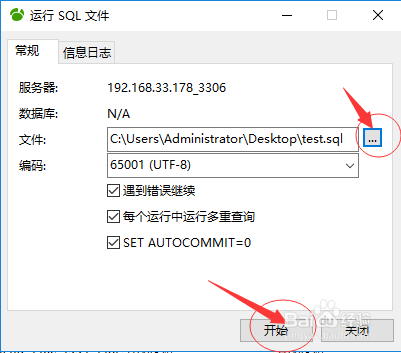 在弹出的运行SQL文件对话框中,选择SQL文件的位置,然后点击“起头”,如下图所示: