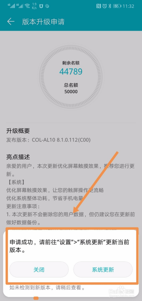 点击后,页面会显示“申请当作功”并弹出对话框,直接点击“系统更新”,转到手机的系统更新页面。
