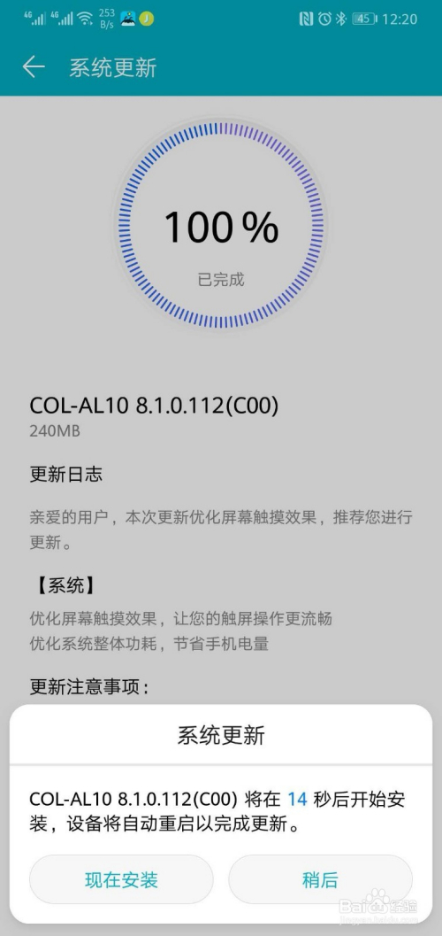 因为更新版本的文件比力年夜,可以在wifi下进行更新版的下载。下载完毕后,系统会提醒是否需要安装,若是不需要顿时安装,可以点击“稍后”,点击后选择在夜间主动更新系统。安装时手机遇主动重启进入安装界面,整个过程一般需要五分摆布。