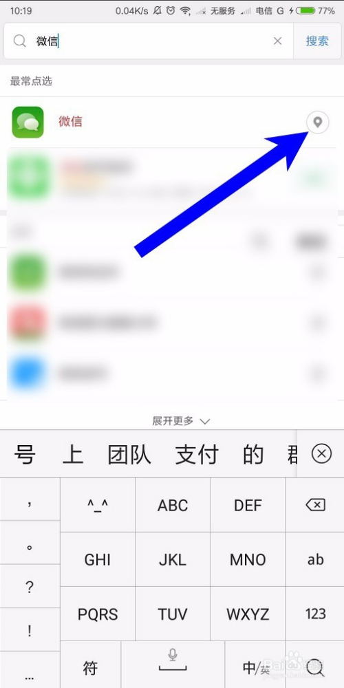 接着在输入框中输入我们想要寻找的手机应用,我们这里以微信为例,搜刮出来之后,我们点击微信右侧的定位图标,如下图所示,