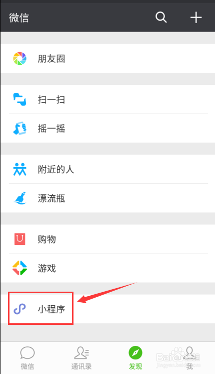 1.首先打开微信(确定微信是最新版),点击发现找到小法式