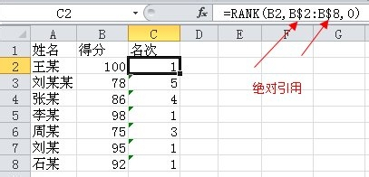 我们在点击确定,然后拉动名次的第一个单位格,成果排序不合错误,是什么原因呢?本来是位置处没有绝对引用,下拉的时辰位置发生偏移,所以我们加上$绝对符号,位置是B2-B8不变,然后我们就可以看到准确的排序了。(若是没有感觉引用的话,C2列就是B3-B9了大师选中单位格一看函数就知道错了),若是大师在碰到小得分排名靠前的话,把order的参数改当作1即可。