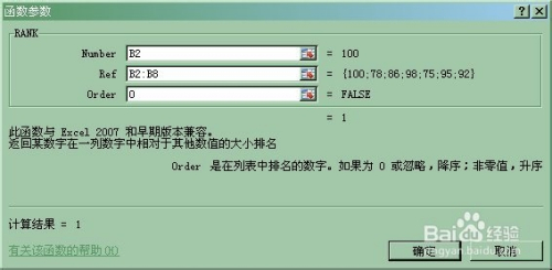 第一个参数我们选中B2第一单位格,然后第二单位格是第二列的数据B2-B8;挨次0是降序,1是升序;得分年夜到小是降序所以选择0;