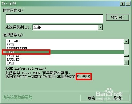 我们选择RANK排名函数,我们看到有3个参数,number,ref,order即数值、引用、排序;